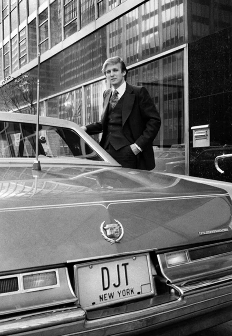 在这张1976年的历史照片上,刚刚在商业领域崭露头角的特朗普以一辆凯迪拉克Fleetwood为座驾。车牌号「DJT」正是他姓名全称Donald John Trump的缩写。
