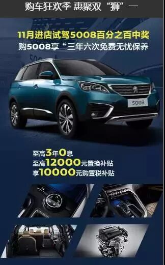 11月11日,购车狂欢季,惠聚双“狮”一——东风标致厂价淘车节感恩来袭,到店参与活动即送精美礼品一份,同时也有试驾5008百分之百中奖,更有置换礼遇等你来,活动当天还设置了免费二手车评估服务。
