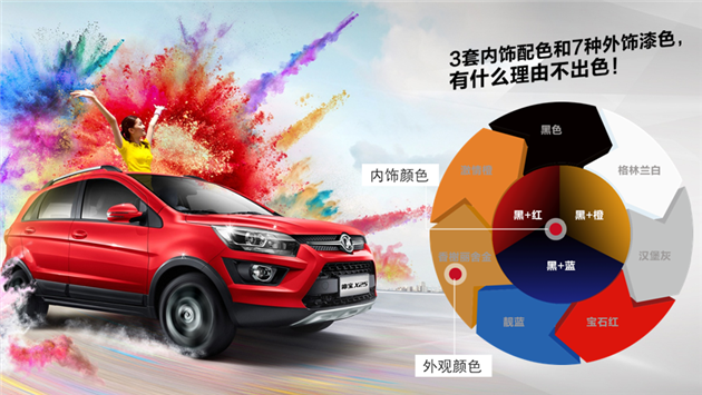 绅宝X25杜绝了千篇一律抄袭风,以原创的设计理念,带来非凡的视觉效果。X形的前脸上镶嵌了醒目的绅宝LOGO,从车头延伸至车尾的笔直腰线,使其身材更显修长,16英寸的抛光铝合金轮圈配上红色刹车卡钳,时尚活力的气质喷薄而出,再加上多达7种的车身颜色,你想要的感觉它都能给你。时尚不仅需要外在,更需要内饰的加持,绅宝X25拥有黑+红、黑+橙、黑+蓝三款内饰配色,大胆的碰撞设计,让你的生活都更潮更有范儿。