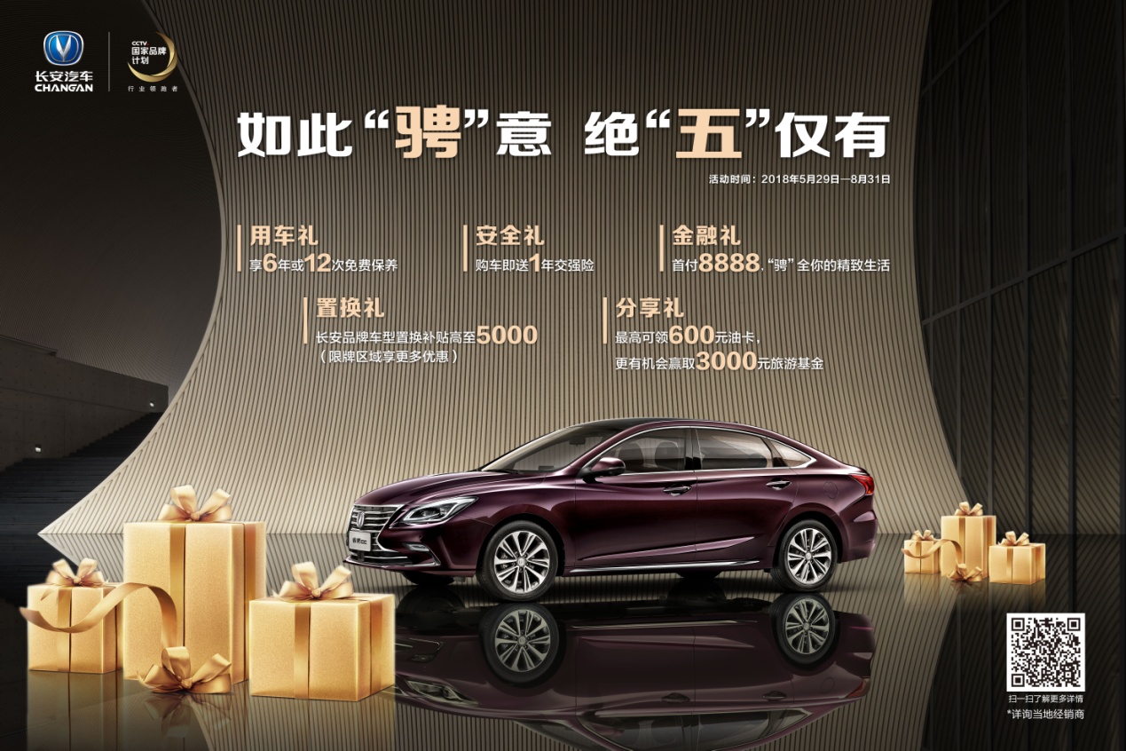 .敢为人先,进取向上,是时代的要求,也是长安汽车一直以来的追求。产品高端化,一直是中国汽车品牌难以逾越的鸿沟,而长安历时5年精心打造推出的睿骋CC,作为其迈向高端化的代表作,以13万级别的价格,实现25万同级别合资车型的价值,在技术和品质上拉近了与合资品牌的距离。从刚开始全新家族化的蝶翼式前脸的关注,到精致内饰优雅性能的赞赏,睿骋CC的车主,真正意义的诠释了“始于颜值,忠于品质”。为了让更多客户体验到睿骋CC带来的品质生活的优雅,2018年5月29日起至8月31日,长安睿骋CC特开展“如此‘骋’意,绝‘五’仅有”主题活动,为精致生活更添一味优雅!