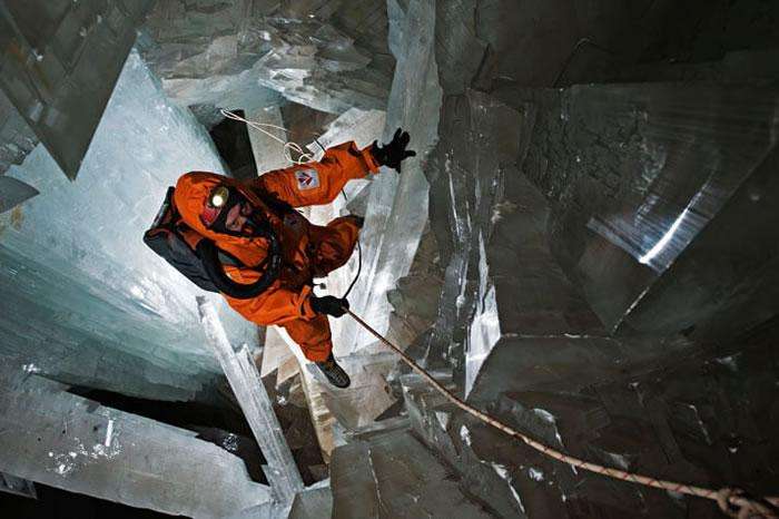 许多水晶非常巨大,以至于我们抱着它们都无法双手合拢。内部的地形非常复杂,行走非常困难。水晶洞中的温度极高,超过了49摄氏度,湿度约为95%。如果没有穿上特制的冷却服,人们一次只能在里面呆上几分钟。