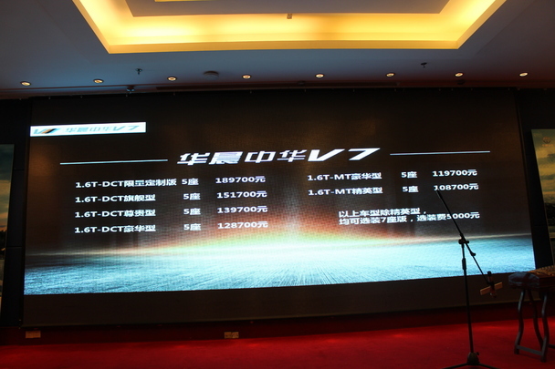 本次华晨中华V7共推出包括1.6T-6MT精英型、1.6T-6MT豪华型、1.6T-DCT豪华型、1.6T-DCT尊贵型、1.6T-DCT旗舰型,以及1.6T-DCT限量定制版共六款全新车型,官方指导价10.87万元-18.97万元。以上车型除精英型外,均可选装7座版车型。
