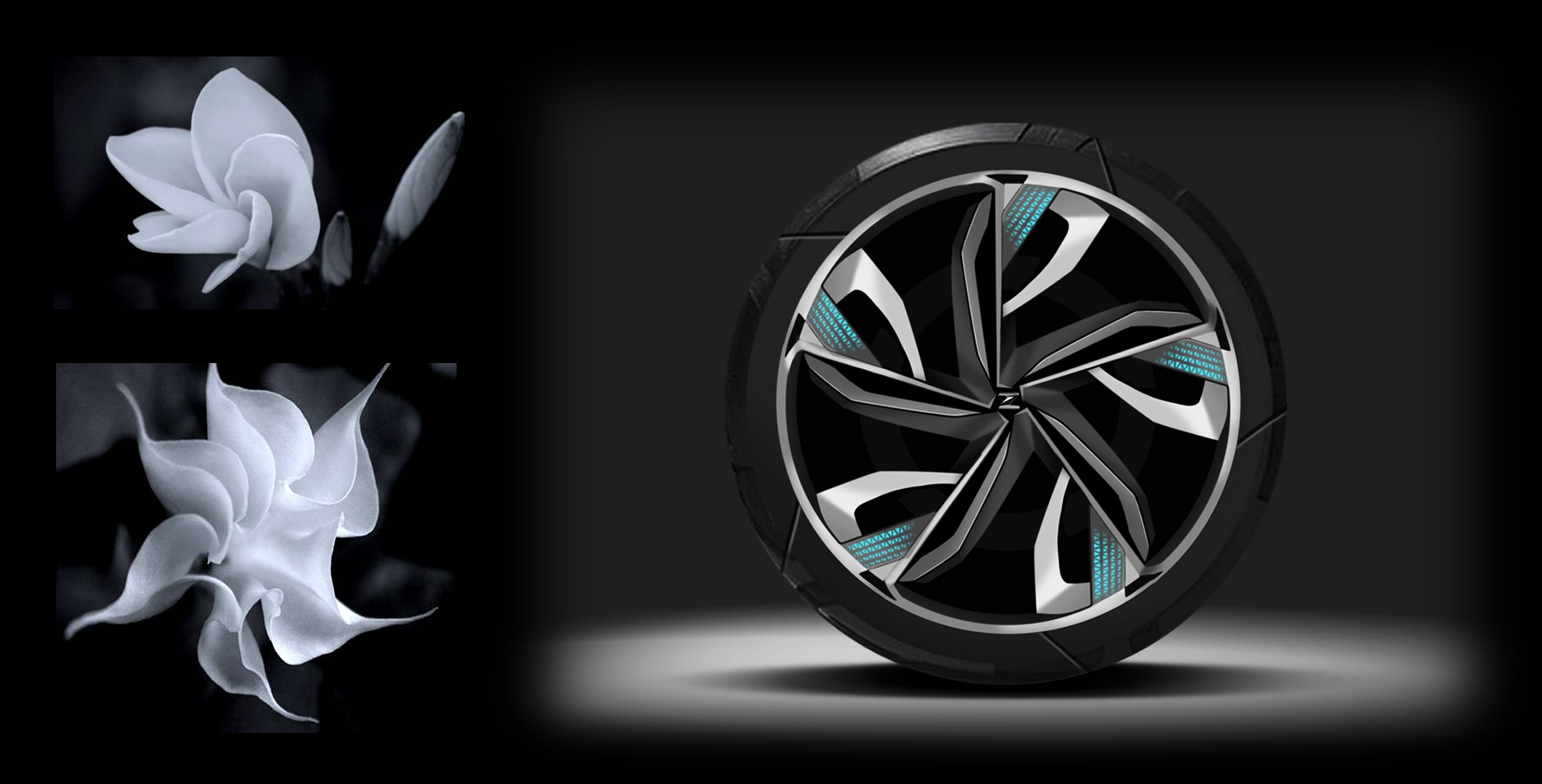 轮毂的形态如同蓄势待放的新蕾孕育着生命和能量,含苞待放、微展花瓣,在不同时节的不同形态,相互交错、相辅相成;丰富的层次,充满新生的能量,柔中带刚的寓意更显独特。