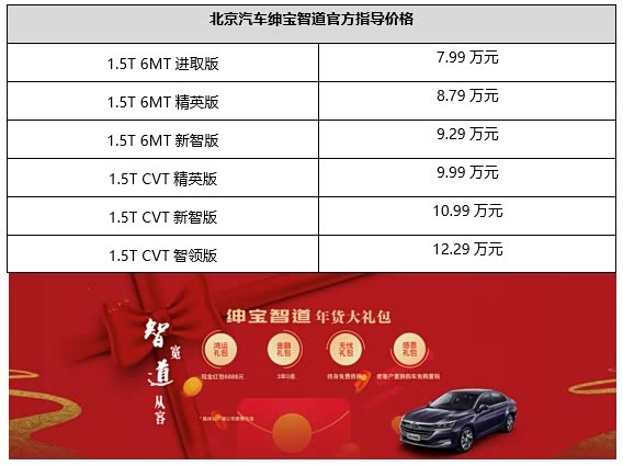 绅宝智道官方指导价7.99万元-12.29万元,剑指B级车市场,以MAX越级产品力成就行业新典范。正值新年来临之际,绅宝智道特别推出了年货大礼包:针对春节前购车的新老客户,赠送6888元鸿运礼包、3年0息贷款金融礼包、 终身免费质保无忧礼包,同时,针对北汽集团旗下所有品牌的老客户,推出置换免购置税感恩礼包,进一步回馈用户的厚爱。