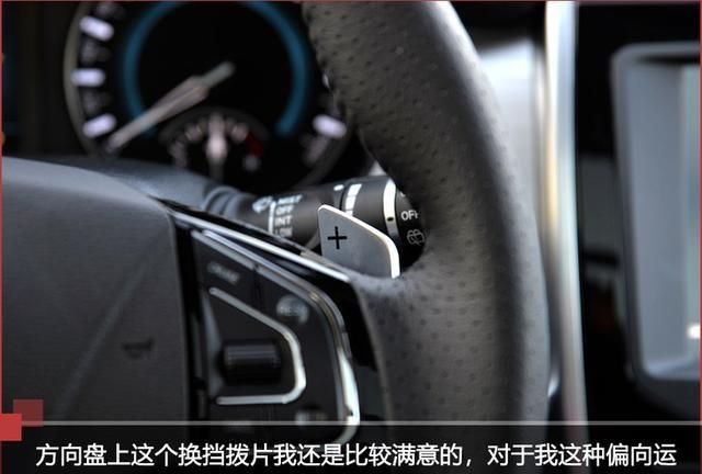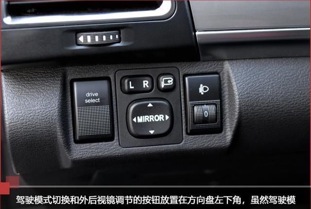 方向盘左下方是外后视镜的调节按钮,该车并没有设计在车门上,这也是可以避免误碰的。左边长方形的按钮为驾驶模式切换,当你切换至运动模式后可以明显感觉到转速升高,换挡有着延迟,可以提供更强的扭力。