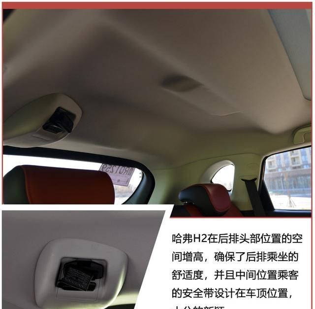 哈弗H2创享版的座椅采用红黑双色拼接,红色的用料有着十足的运动气息,后排的座椅同样是双色拼接,并且在车顶部采用内凹的设计,让后排乘客有着充足的头部空间。中间乘客的安全带被设计到内饰顶上,这一点也是脱离了普通车型的,看着十分新颖。