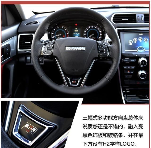 打开哈弗H2的车门,内饰的整体布局十分简洁明,没有过多的复杂按键,三幅式多功能方向盘带有换挡拨片,这也给了驾驶者一定的驾驶感。方向盘采用打孔的设计,握感上十分出色,底部H2的字样也是衬托出一定的档次感。