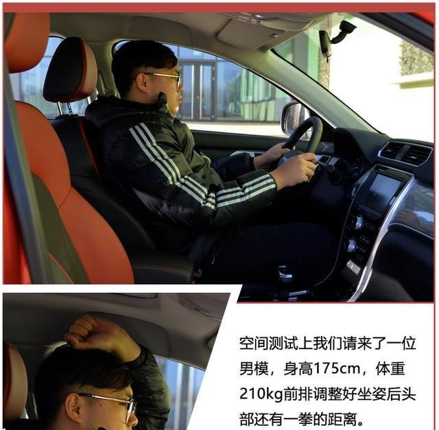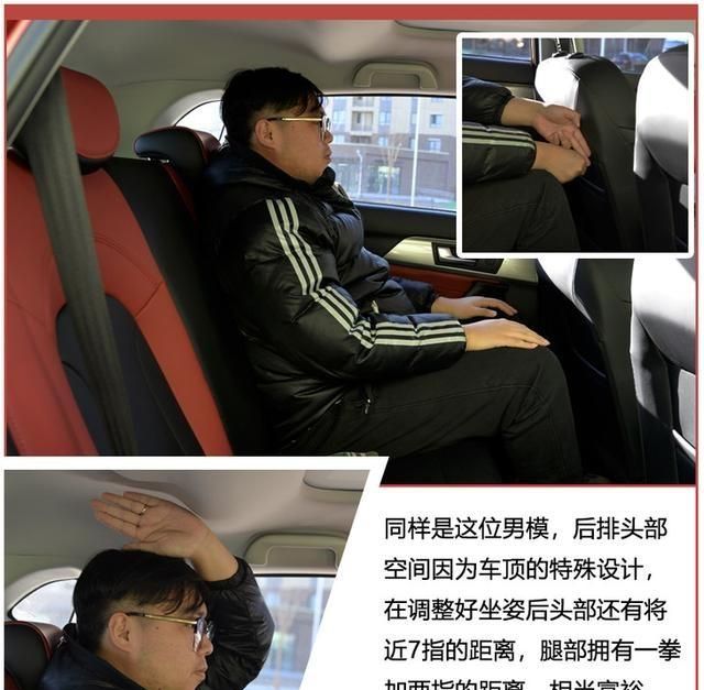 乘坐空间上,我们请来了专业男模,前排调整好坐姿后头部还有一拳的距离,非常的充裕,而后排也是比较富裕,车顶的设计使其头部空间有着将近7指的距离,腿部空间也是一圈加两指,非常宽大。