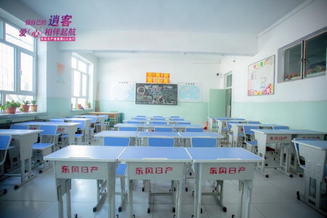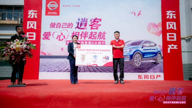 领导致辞过后,”做自己的逍客,爱心相伴起航”东风日产逍客公益行捐赠活动正式开始。东风日产新疆区销售督导张磊先生、精诚学校校长荆亚红女士共同上台,张磊先生代表东风日产向精诚学校捐赠了150套全新桌椅,全校班级讲台以及学习用品,为孩子们提供更好的学习环境。