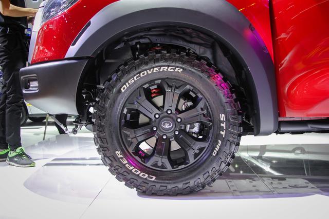 长城炮亚光的黑色轮毂也格外有越野性,其规格为275/65 R18,品牌为来自固铂的DISCOVERER STT Pro系列轮胎,从花纹就可以看出其抓地力非常强。
