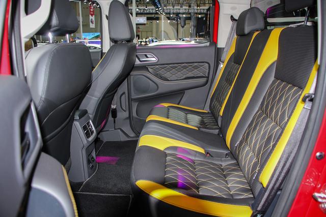 在座椅方面,长城炮的座椅非常的厚实,而且采用了菱形的网格,配上黄色的缝线全面向舒适性看齐。不过由于车身设计的原因,后排座椅角度不能调整,坐姿较直,舒适性一般。