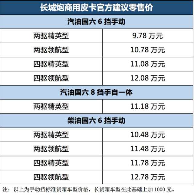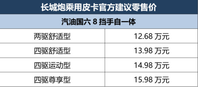 其中,长城炮乘用皮卡官方建议零售价区间为12.68-15.98万元,全系搭载2.0T汽油国六发动机,匹配8挡手自一体变速器;长城炮商用皮卡官方建议零售价区间为9.78-12.88万元,包括汽/柴油发动机、8挡手自一体/6挡手动变速器、两驱/四驱、标准货箱/长货箱、精英型/领航型共17个版本供消费者选择。