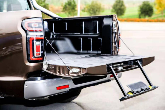 长城炮乘用皮卡货箱尺寸为1520*1520*538mm,标配阻尼后尾门、隐藏式踏板、坡道梯卡槽,可选装不同形式的货箱盖。