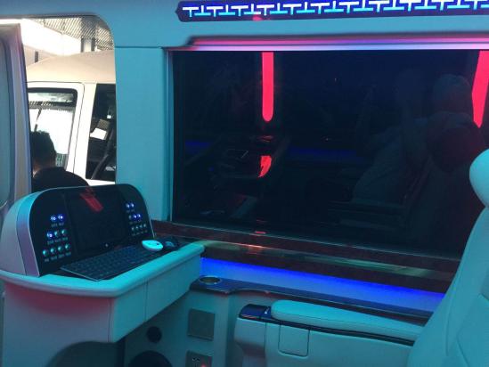丰田考斯特改装商务车内饰地毯的选择上,我们可以选择阻燃式通道地毯,在配备上带有蓝色灯光的通道压条。