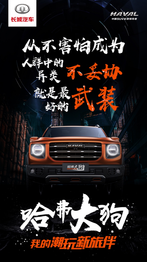 “哈弗大狗”这样的名称充满着信赖、灵性和力量感的联想,在#哈弗征名 一字万金#的征名活动中也成为认同度最高的名称,体现了网友对哈弗全新品类SUV产品的直观印象。不论是独特的哈弗大狗名称,还是与众不同的外观设计,都与年轻人钟爱的“潮”流风不谋而合。随着哈弗大狗的推出,哈弗品牌或将引领SUV的另一风潮:在传统功能性与性能优势之外,融入潮流化的新消费趋势