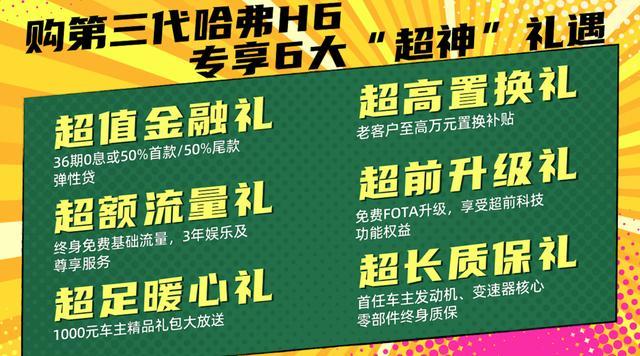 哈弗品牌此次更倾情推出6大"超神"礼遇,不仅有超值36期0息或50%首款/尾款的超值金融礼、老客户至高万元的超高置换礼、1000元车主精品大礼包的超足暖心礼,更有终身免费基础流量+3年娱乐、尊享服务的超额流量礼、免费FOTA升级的超前升级礼、首任车主发动机+变速器核心部件终身质保的超长质保礼!6大礼遇,个个"超神",就问谁能不心动?
