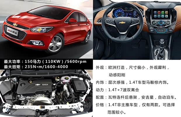 科鲁兹在设计上与上一代车型的变化是翻天覆地的,但是在越改越大的汽车市场,科鲁兹的小尺寸在同级别车型中已经没有什么优势了。科鲁兹1.4T车型的内饰具有层次感,并且采用马鞍棕配色,十分漂亮。后悬架延延续上一代的瓦特连杆,虽然也称不上是独立悬架,却能给操控带来一定提升。