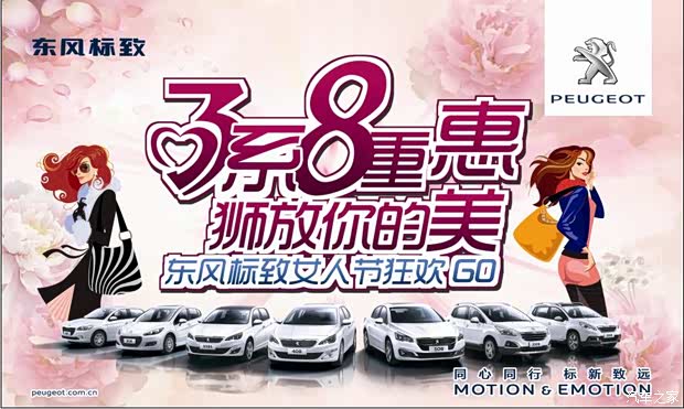 三月女人天,亮丽女人节,标致女人,温暖绽放。东风标致德阳明致4S店将在3月5-8日举行《3系8重惠 狮放你的美——东风标致女人节狂欢GO特惠专场》活动,期间只要您来到我们现场签到即可获得精美礼品。形式多样的活动,意想不到的团购政策,让您切实享受到团购的优惠力度,更有温馨购车礼等您!女人节,您“享购”了吗?