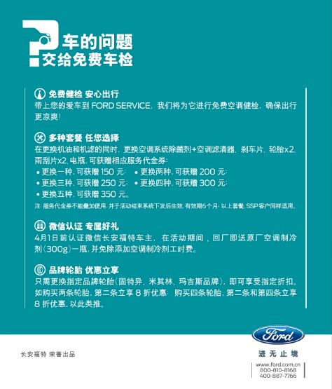 4月1日至5月31日,来德阳宗越福特店即享免费空调检查、零件套餐、微信认证车主大礼,轮胎优惠,到店立享!快来吧!详询热线:0838-6939009