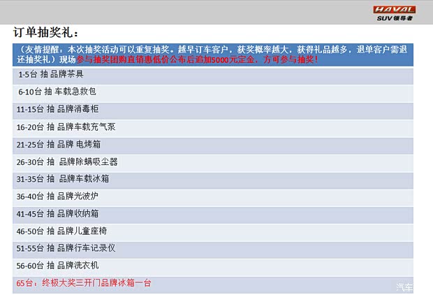 4、活动期间参加“庆祝哈弗SUV销量率先突破300万辆,感恩欢乐送——派3亿红包,送300万大礼”的感恩活动,所获“金额”与本次活动同时享受优惠。