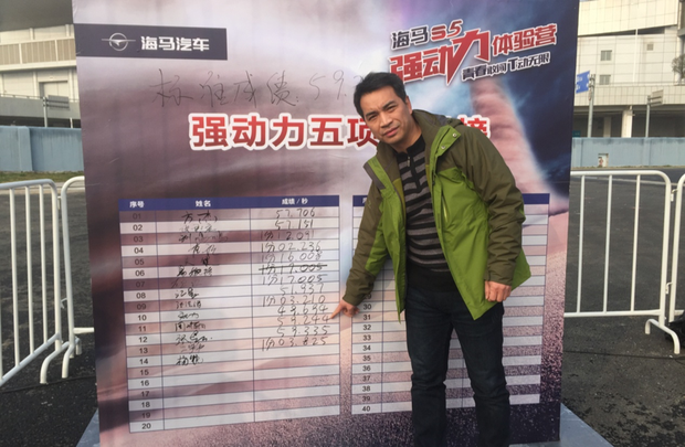 经过紧张刺激的比拼,总用时为59.244秒的周先生以与试驾教练相差0.02秒的成绩最终胜出,并且他与第二名张先生仅有相差0.09秒的微弱优势。赛后周先生坦言:“这次胜出纯属运气,但也在紧张刺激的比赛中充分感受到了海马S5的强动力带给我的愉悦感,玩的很开心。”