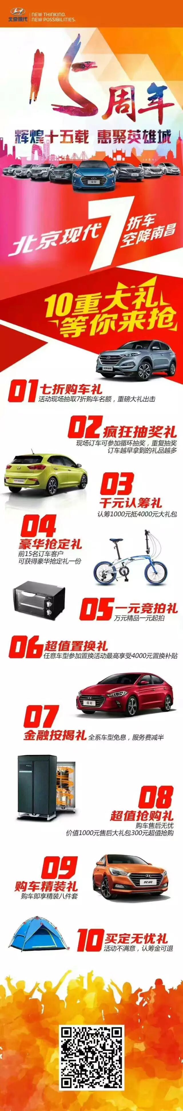 【太平洋汽车网 南昌商家动态频道】特大好消息!好消息!好消息!4月22日北京现代15周年庆携7折特价车惠至全城,交1000元认筹金抵4000元超级大礼包,厂价直销万元让利,更有十重购车厚礼等你拿,优惠更胜五一车展。快来华宏北京现代报名吧!