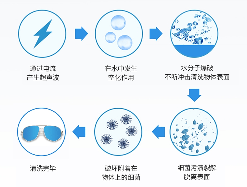 超声波清洗机的工作原理就是利用超声波(不同频次Hz)的振动来搅动液体,使得水分子在超声波的作用下不断碰撞挤压,最后发生破裂冲击物体污迹达到清洗目的!这一过程不需要拆卸零件就可以进行深度清洁!它运用在不同行业中。早期多是工业使用发展到现在小家电都会使用到这一技术!