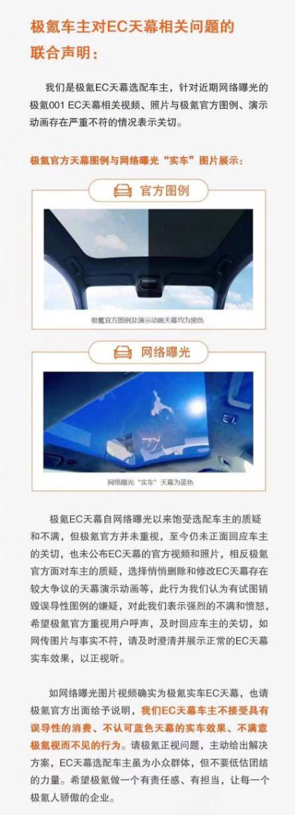 联合声明中表示,极氪官方的天幕展示图和动画展示里颜色均为黑色,但已经拿到实车的车主发现天幕为蓝色。维权车主表示,不认可EC天幕蓝色的实车效果,认为厂家存在误导性消费的行为。
