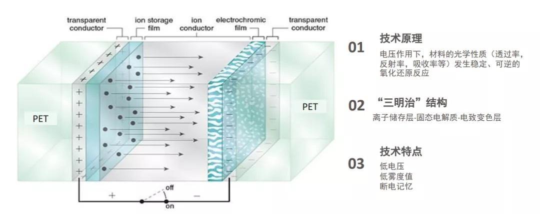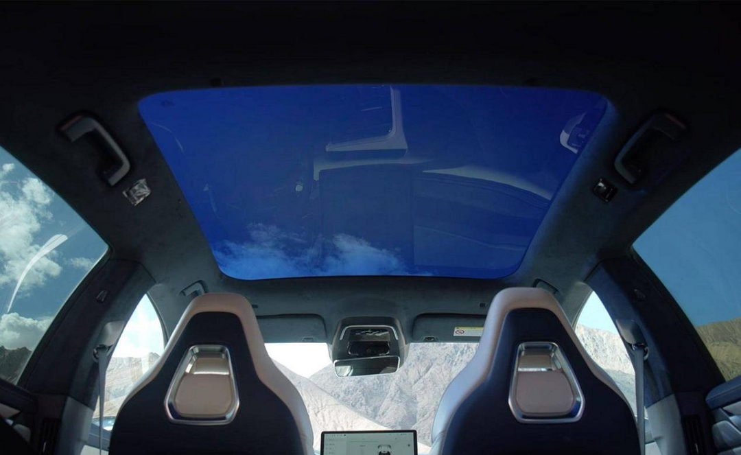 而EC电致变色调光玻璃则可以很好的解决调节明暗以及隔热的问题,与PDLC的物理反应不同,EC电致变色调光玻璃是通过让玻璃内的特殊材料产生化学反应,从而使玻璃中的电解质可以在透明状态下进行切换。用一个不太恰当的比喻,EC电致变色调光玻璃切换后的状态更像是给玻璃天幕带了一个墨镜。而且,这种技术对于隔绝红外线、紫外线以及热辐射也有很好的效果。
