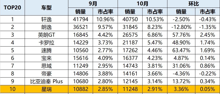 近几年,中国汽车品牌的爆款车型频出,老牌合资车型正面临着严峻的挑战,依托自主汽车头部品牌吉利汽车,星瑞凭借优越产品力正探头显势。10月销量达到12053台,上市一年累销126873台,平均月销过万。