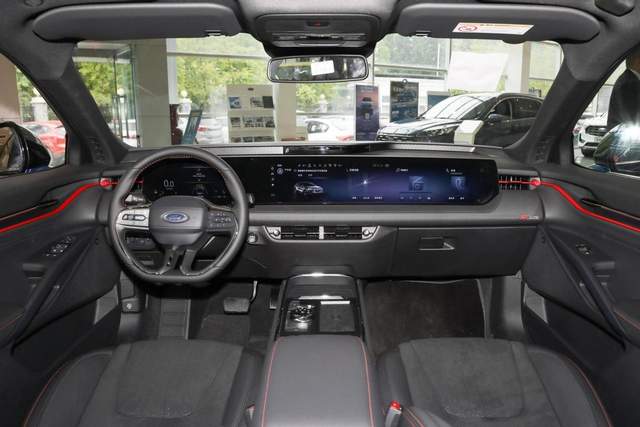 长宽高分别为4920/1920/1600mm,轴距为2945mm,虽然定位中型SUV,但修长的造型跟那台雪铁龙凡尔赛C5 X有点类似,满满的跨界味道。如果说中控台液晶大连屏是新能源汽车的“首创”,那福特EVOS就是第一个把它放到燃油车上的车型。连屏长度有1.1米那么长,全液晶仪表盘为12.3英寸,分辨率可以达到2K,而多媒体屏幕尺寸为27英寸,分辨率更是达到了4K,还集成了全新一代SYNC+ 2.0智行系统,里面的行车辅助和娱乐功能一应俱全,跟理想ONE一样也可以进行手势控制。科技属性非常强,这个配置在同级别的燃油车中几乎是见不到的。EVOS还配备了车路协同系统,同时它也是最早以及国内首款实现车路协同系统的车型。然而这种屏幕都有一个通病,就是看久了会容易视觉疲劳,如果效果好的还会分散注意力,这就很考验驾驶者了。