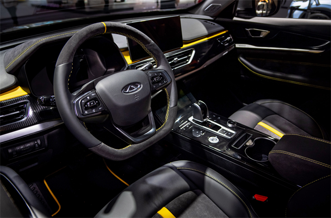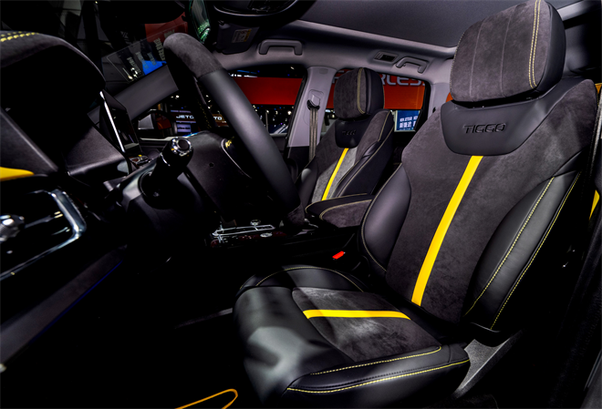 内饰方面,在用户能触摸到的方向盘、门板、座椅等部位大量包裹了Alcantara材质,座椅上还印有“TIGGO”的瑞虎英文标识。在彰显运动性能的黑黄配色方案、碳纤维纹理面板和黄色装饰条的衬托下,让整个座舱充满豪华质感与运动气息。