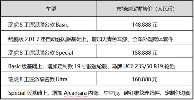 全新联名改装车共分Basic、Special、 Ultra三款车型,官方指导价为148,888元-168,888元。同时,11月20日-11月30日间,前100名通过“工匠派微信小程序”支付1,888元意向金的用户,可免费进行配置升级,即订购Basic版,增配为Special版;定购Special版,增配为Ultra版。