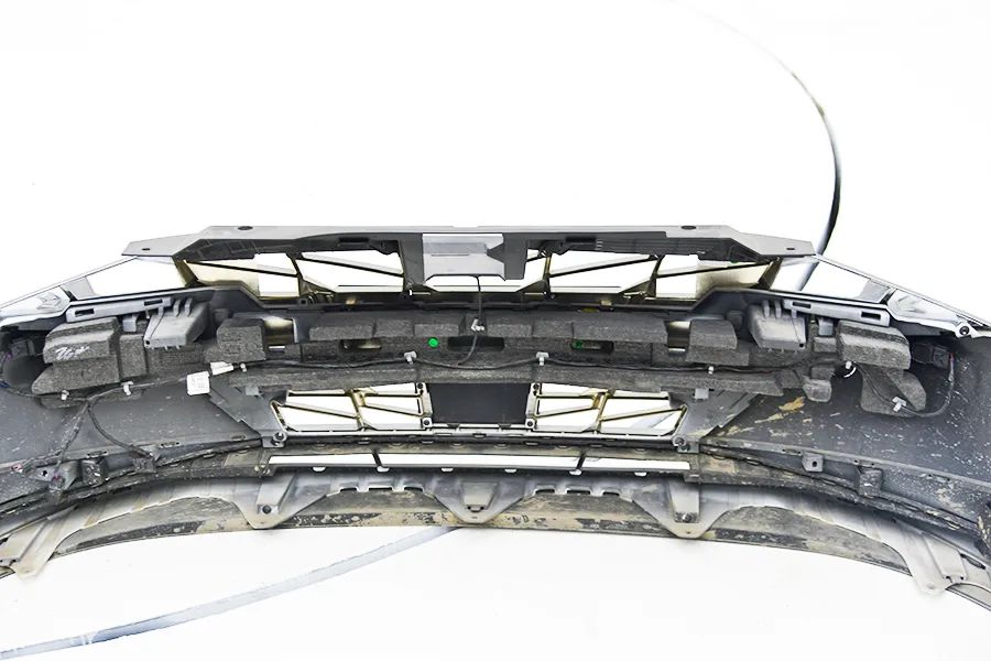 拆开前保险杠,内部有一根单层冲压钢板防撞梁,厚度仅为1.24毫米,能覆盖车头部分的67.42%。