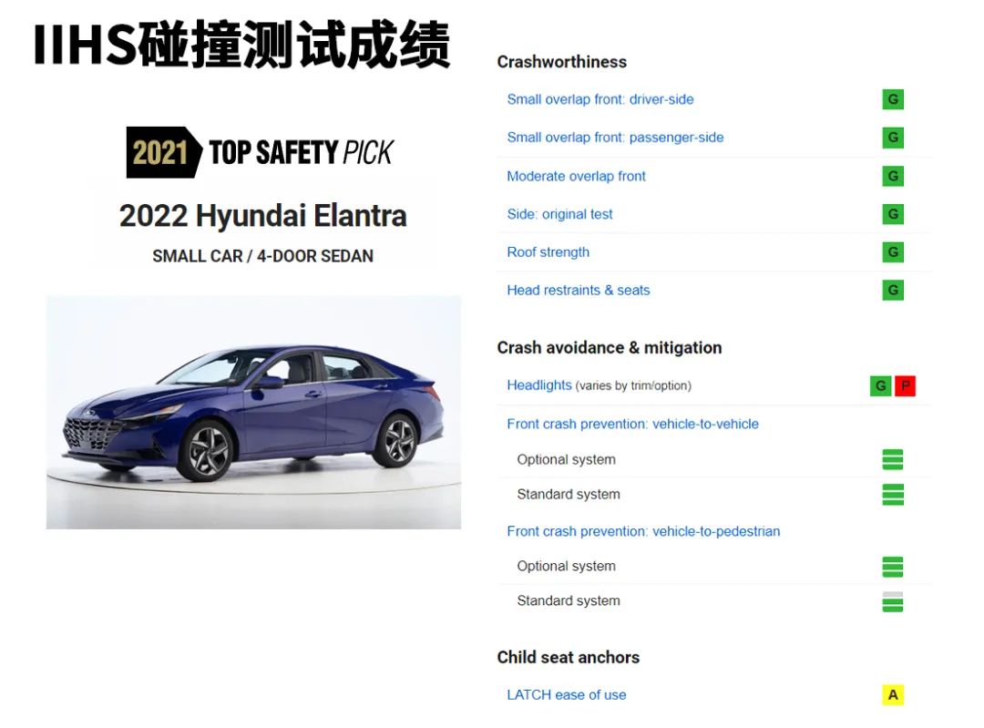 目前这款车在北美IIHS进行过碰撞测试,从测试结果来看,比较不错,得到了IIHS年度“安全之选”称号。不过,对于国产伊兰特,这个成绩仅作参考。
