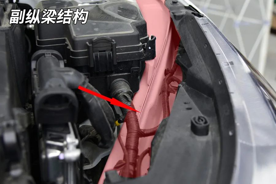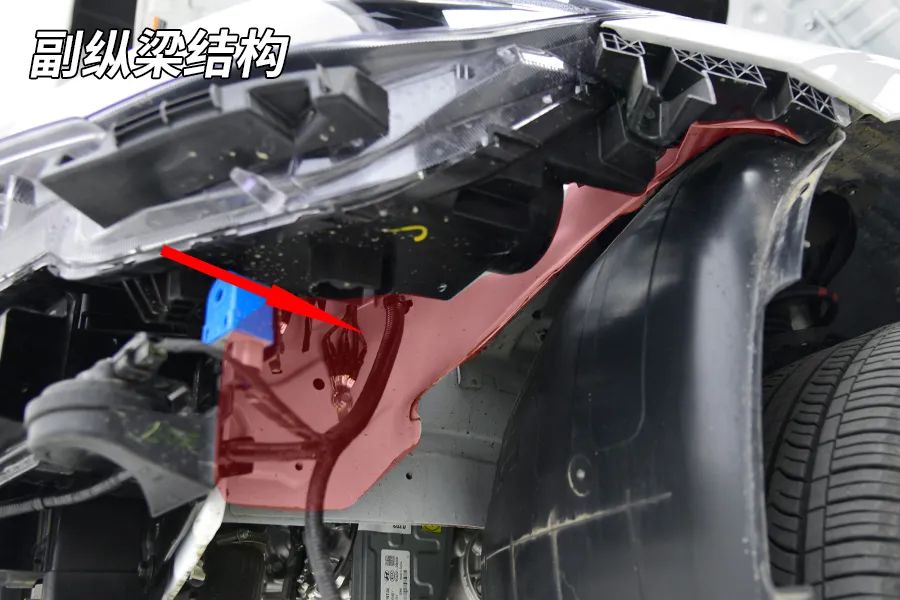 副纵梁的结构设计比较新,“shotgun”向前凸出,与纵梁部分相连接,形成一个比较完整的闭环受力结构,有利于对偏斜碰撞的保护。