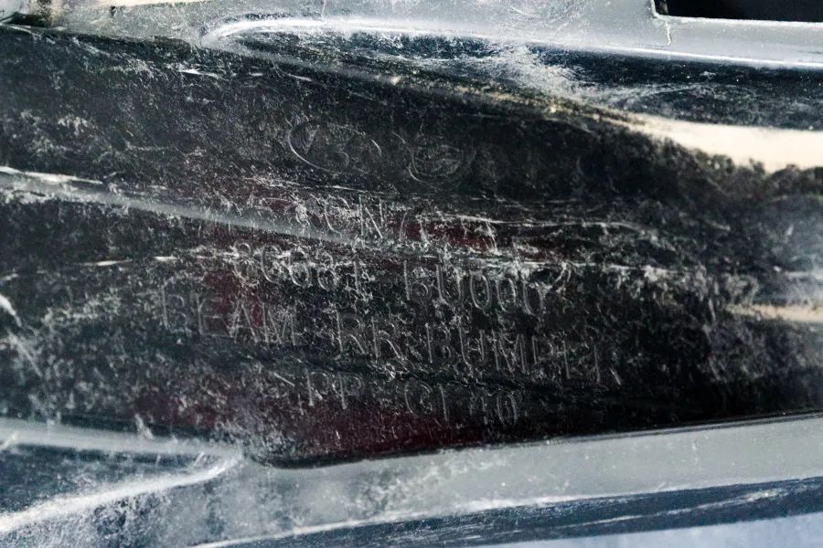 只有一根固定在后保险杠的塑料支架,能够清楚的看到“PP GF40”标识,说明这是含有40%玻纤的PP工程塑料。这种材质吸能效果较差,在低速碰撞中很容易断裂,无法形成良好的保护。