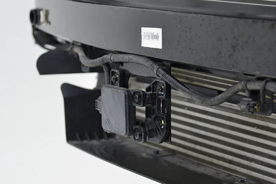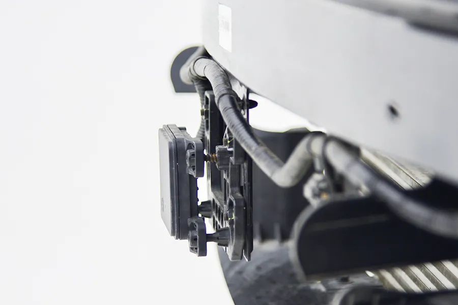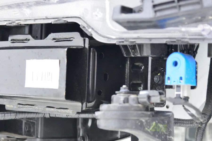 前ACC雷达使用了一个塑料框架固定在防撞梁下方,并且向外凸出。这种设计比金属支架要好一些,至少在发生碰撞时,塑料会率先断裂,可以保护雷达不受损。