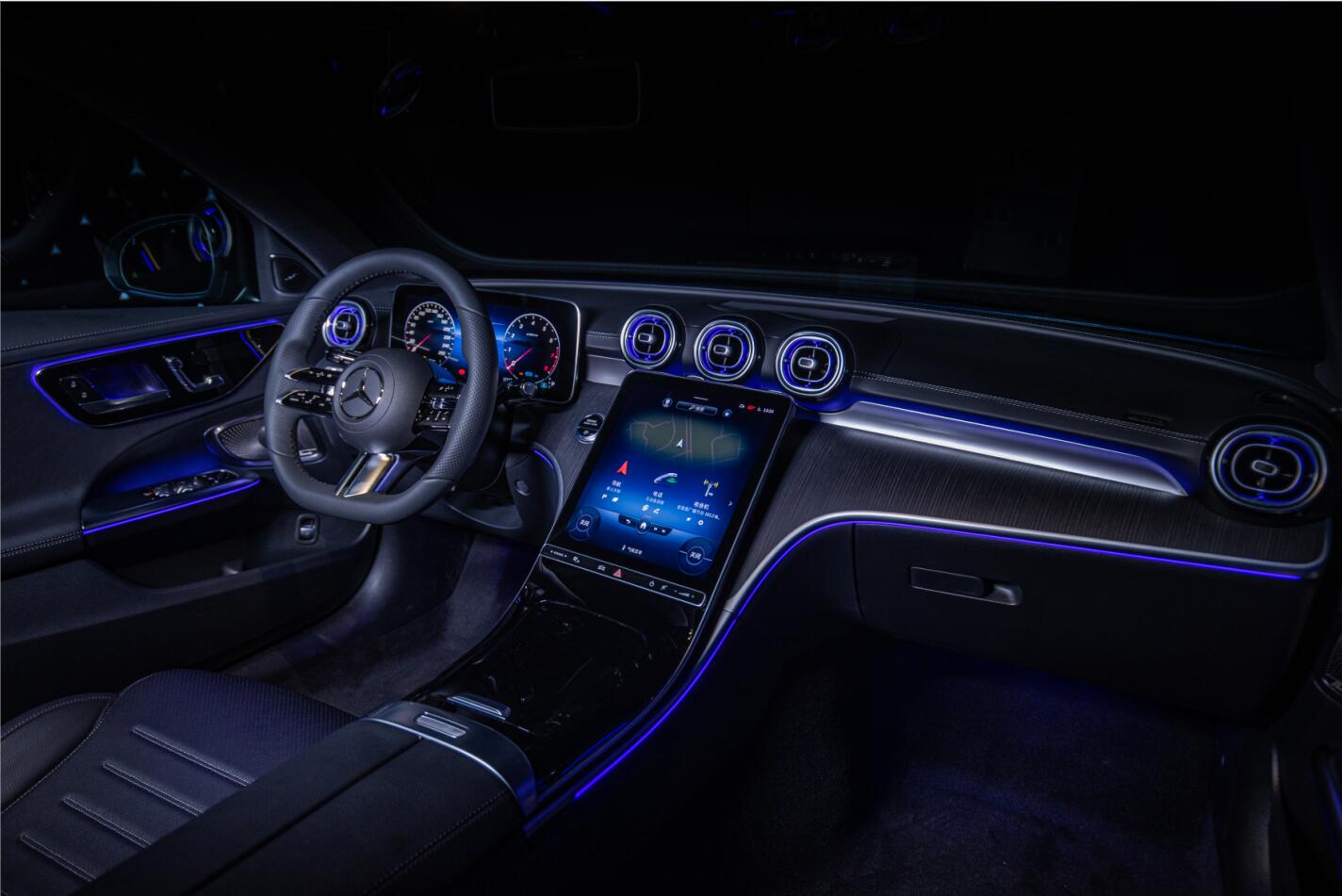 车内,重新布局的仪表台纵横有致、曲直相宜,12.3英寸数字仪表屏和11.9英寸高清中央触控屏采用悬浮式设计,垂瀑式中控屏以优雅的弧形曲线与中控台流畅衔接。全新长轴距C级车首次采用了以驾驶员为中心的内饰设计,中控屏向驾驶员倾斜6度。“浮岛”造型的座椅按键区及车窗按键区等大量悬浮式操控组件,更将功能性与设计感完美融合,其中“星环出风口”创新嵌入64色环境氛围灯带,营造出如同神秘星环的光影氛围,再结合精妙入微的脱敏镀铬工艺以及特别调校的旋钮阻尼质感,细节之处皆为豪华。