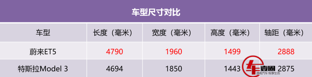 车身尺寸方面,大家可以看到蔚来ET5处于全面领先地位,尤其是在车长和车宽两项,差距都在100毫米左右,但轴距的差异却很小,仅10毫米左右。所以《车壹圈》猜测,ET5和Model 3在车内乘坐的纵向空间方面应该差异不大,但ET5的横向空间和后备箱实用性应该会有明显优势。