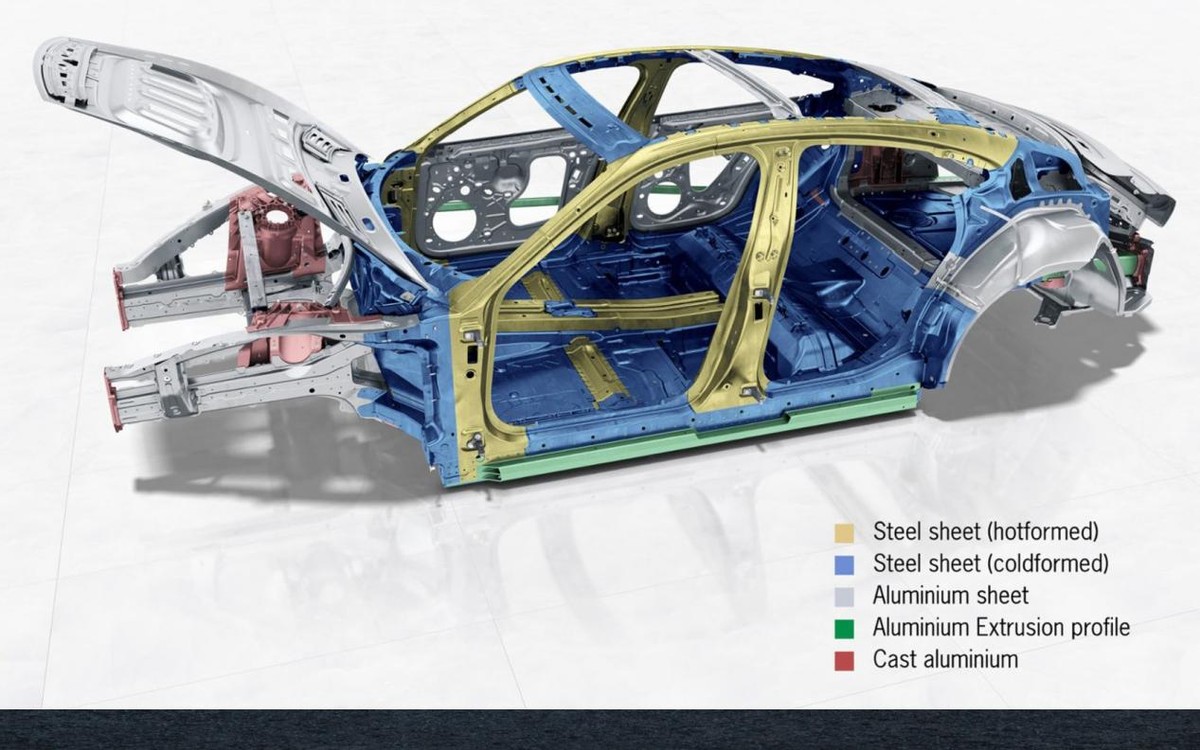 Taycan的车身主要由钢和铝通过不同的粘合技术连接在一起。B 柱、侧车顶框架和座椅横梁由热成型钢制成,而隔板横梁由硼钢制成,安全标准和配置全系相同,值得肯定。