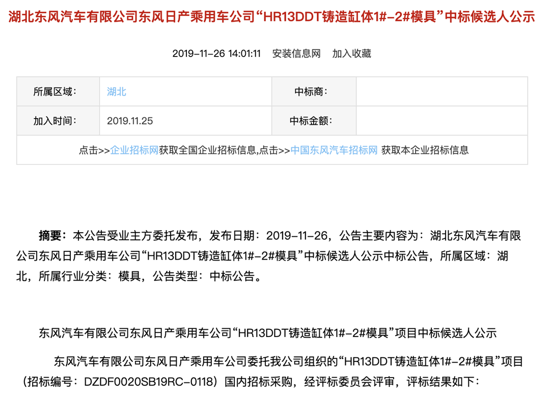 东风日产发布的1.3T发动机生产项目招标公告