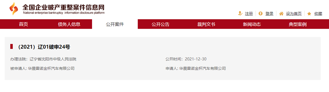 华晨雷诺金杯的破产信息