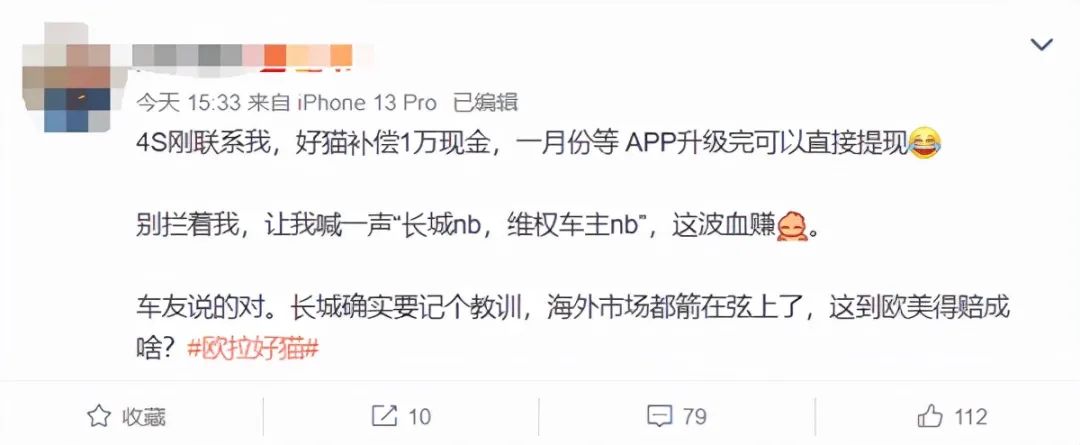 微博欧拉好猫车主表示收到折现赔偿