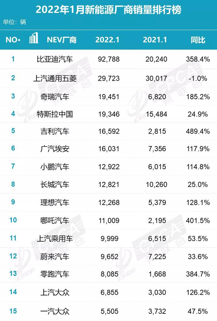 2022年开年首月的市场之争,伴随着乘联会以及各大车企新能源汽车的销量公布已经是尘埃落定。根据公开的销量显示,1月份,新能源汽车销量最好的车企就是比亚迪,单月销量高达92788台,同比增长358.4%,是排在销量第二名上汽通用五菱的3倍还多,是南北大众新能源汽车单月销量总和的7倍多。
