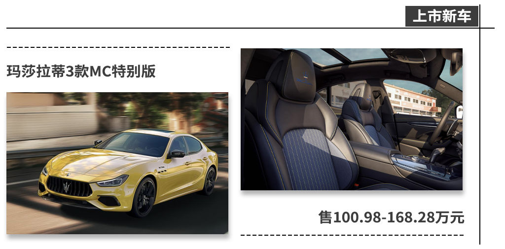 上周,玛莎拉蒂推出了Ghibli、Levante以及总裁共3款MC特别版车型。MC即Maserati Corse(玛莎拉蒂赛车部门)的缩写,MC特别版系列承载着玛莎拉蒂深厚的赛道基因。回到车型本身,Ghibli、Levante及总裁的MC特别版搭配赛道黄和凯旋蓝两款专属颜色,而内饰部分,由于目前只有官方给出的图片,所以小编就把我们能看到的信息做一个分析。座椅配色上,相信3款MC特别版车型为了和外观的配色进行呼应,所以内饰的配色都换成了黄色和蓝色的拼接颜色,而且车内随处可见的专属于玛莎拉蒂的独有标志,也都透露着精致的讯息。