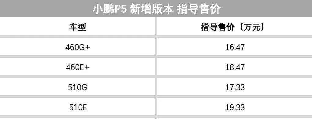 上周,小鹏P5新增了460+、510两种续航版本共4款新车型,补贴后售价16.47万元起。加上目前在售的460、550、600三个版本,小鹏P5在售车型达到了10款。相较于此前在售的几款车型,新增上市的460+的2个版本为此前460版本的衍生车型,主要变化为从460的17寸五辐星轨轮毂升级为18寸多辐镭射轮毂,但NEDC工况续航也因此从460km降为450km,价格同步上涨2000元。而510G/510E则为550G/550E的衍生车型,前后者的区别仅在前者的续航从550km降为510km,而售价则相较后者便宜了500元。