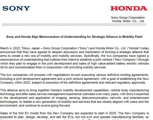 此外,两家公司称,本田将负责生产第一款车型,而索尼将开发移动服务平台。与此同时,两家公司的总裁将于下午在东京举行联合新闻发布会。