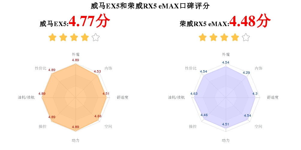 根据口碑评分系统显示,威马EX5的综合得分为4.77分,荣威RX5 eMAX的综合得分为4.48分,普遍来看,用户对于威马EX5的评价更高。