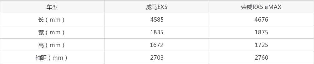 从车身尺寸来看,荣威RX5 eMAX的车长、车宽、车高、轴距要比威马EX5更大。